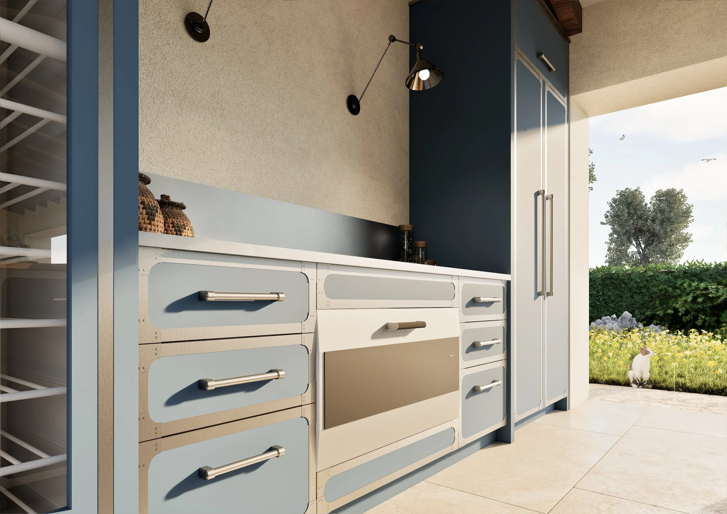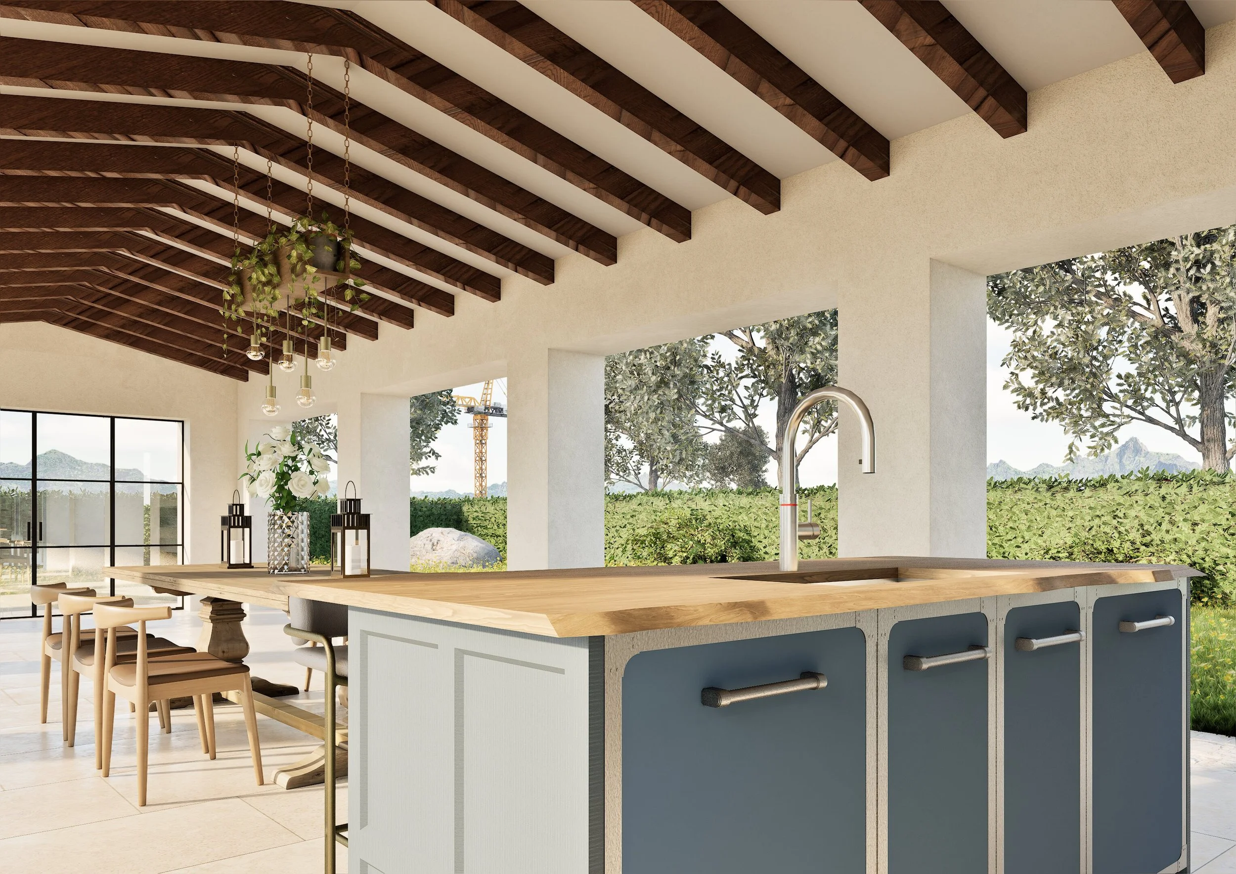 This refined pool house kitchen in Son Font combines modern elegance with functional design. Featuring bespoke metal framing details, custom cabinetry, and integrated luxury appliances, the space is tailored for effortless indoor-outdoor living. Clean lines, premium materials, and a minimalist palette create a sleek yet welcoming atmosphere, perfectly suited for entertaining in style.