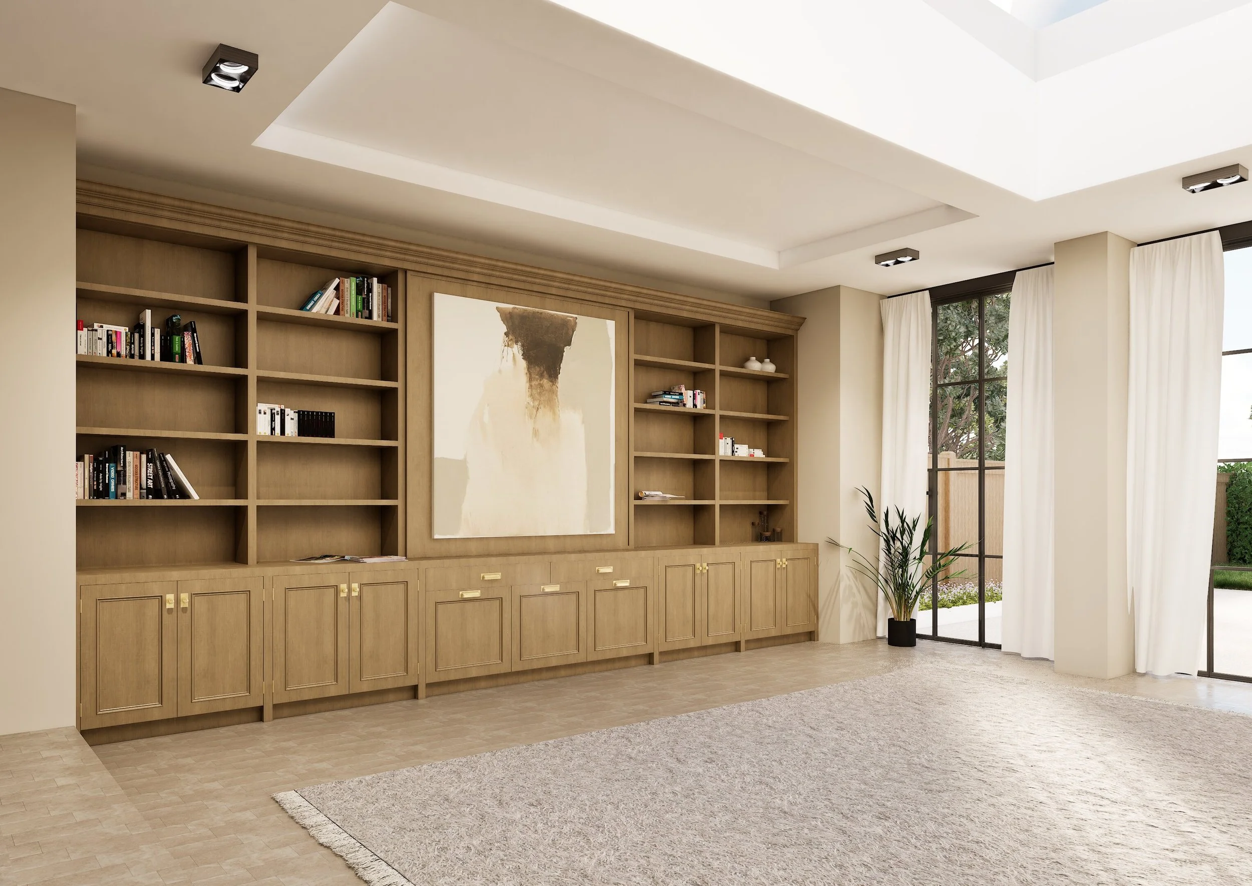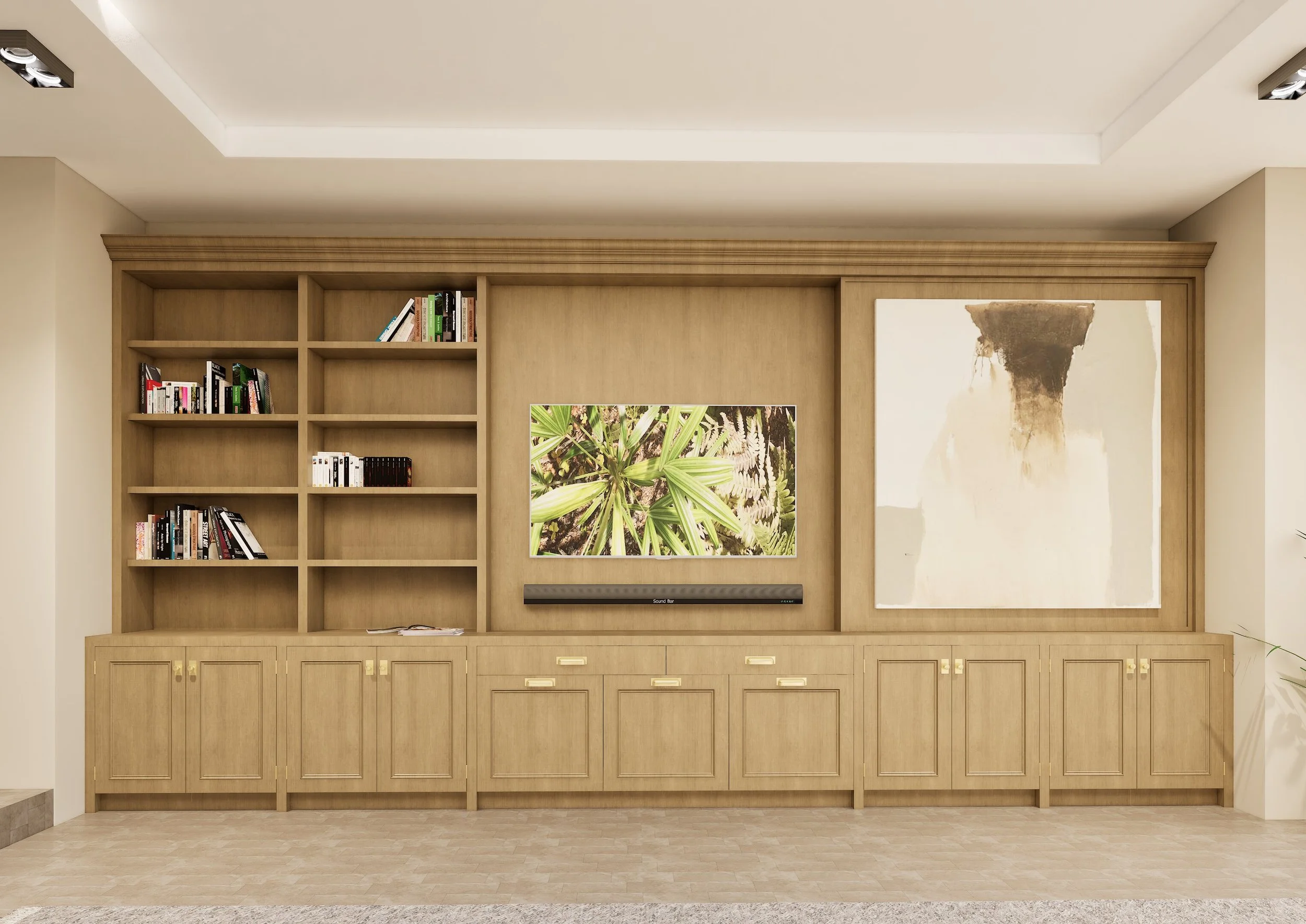 A solid wood media unit features a sliding art wall, seamlessly blending functionality and style. Opposite, a bespoke drinks area with glass-fronted book storage adds elegant storage and display, creating a balanced and sophisticated living space.