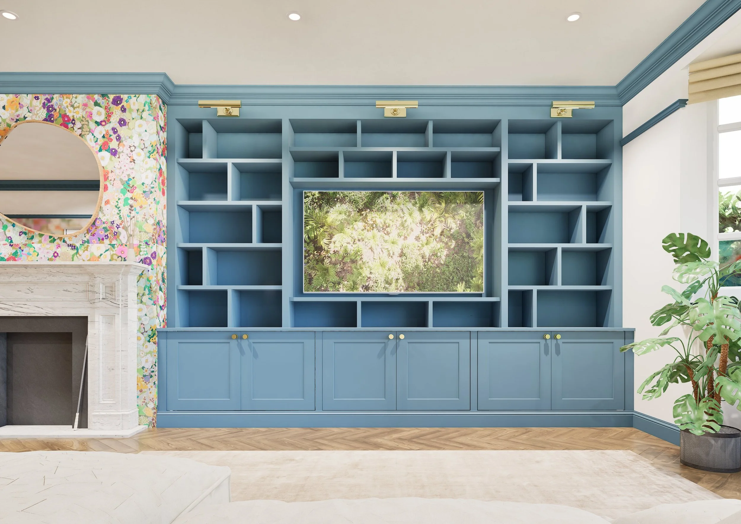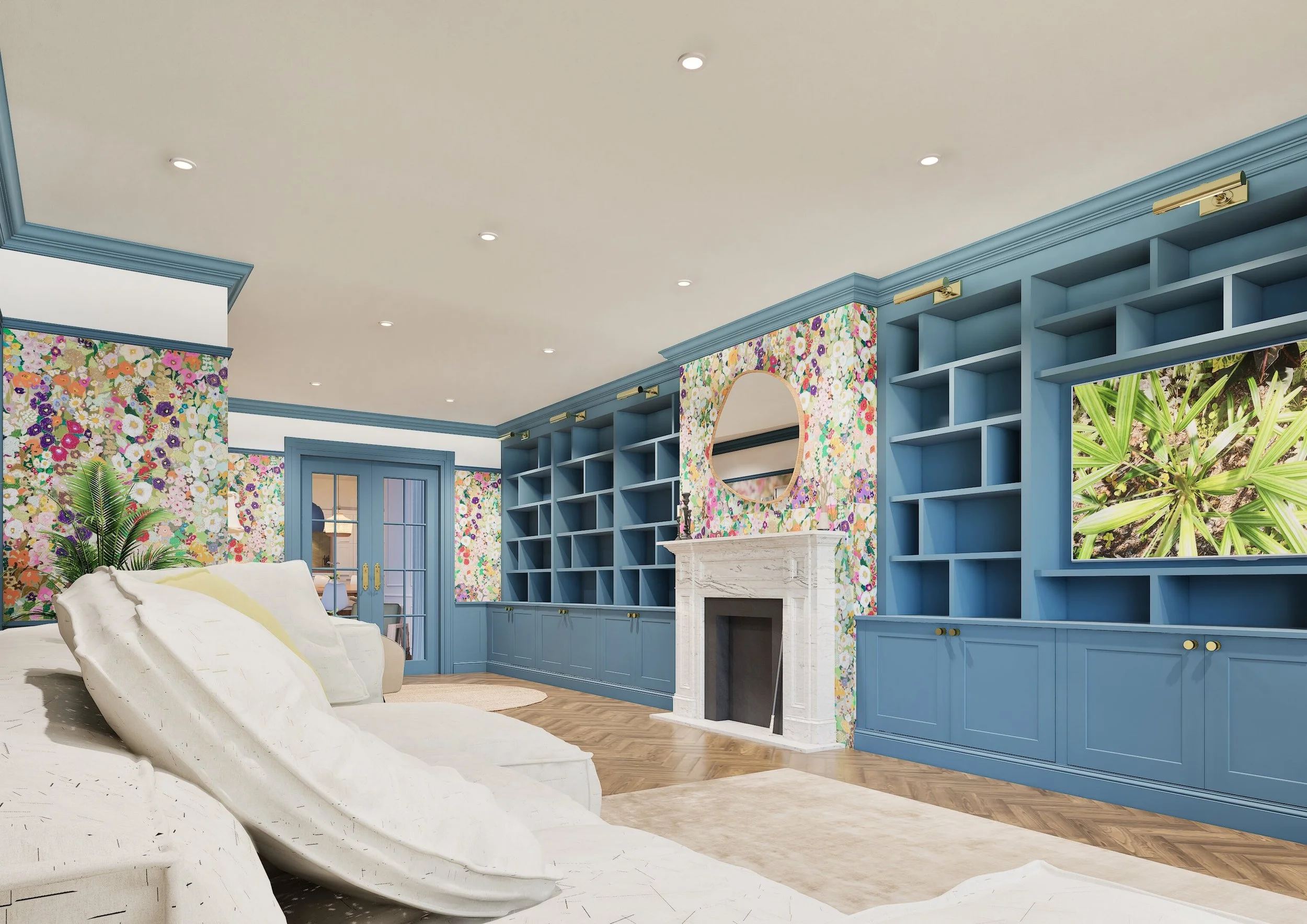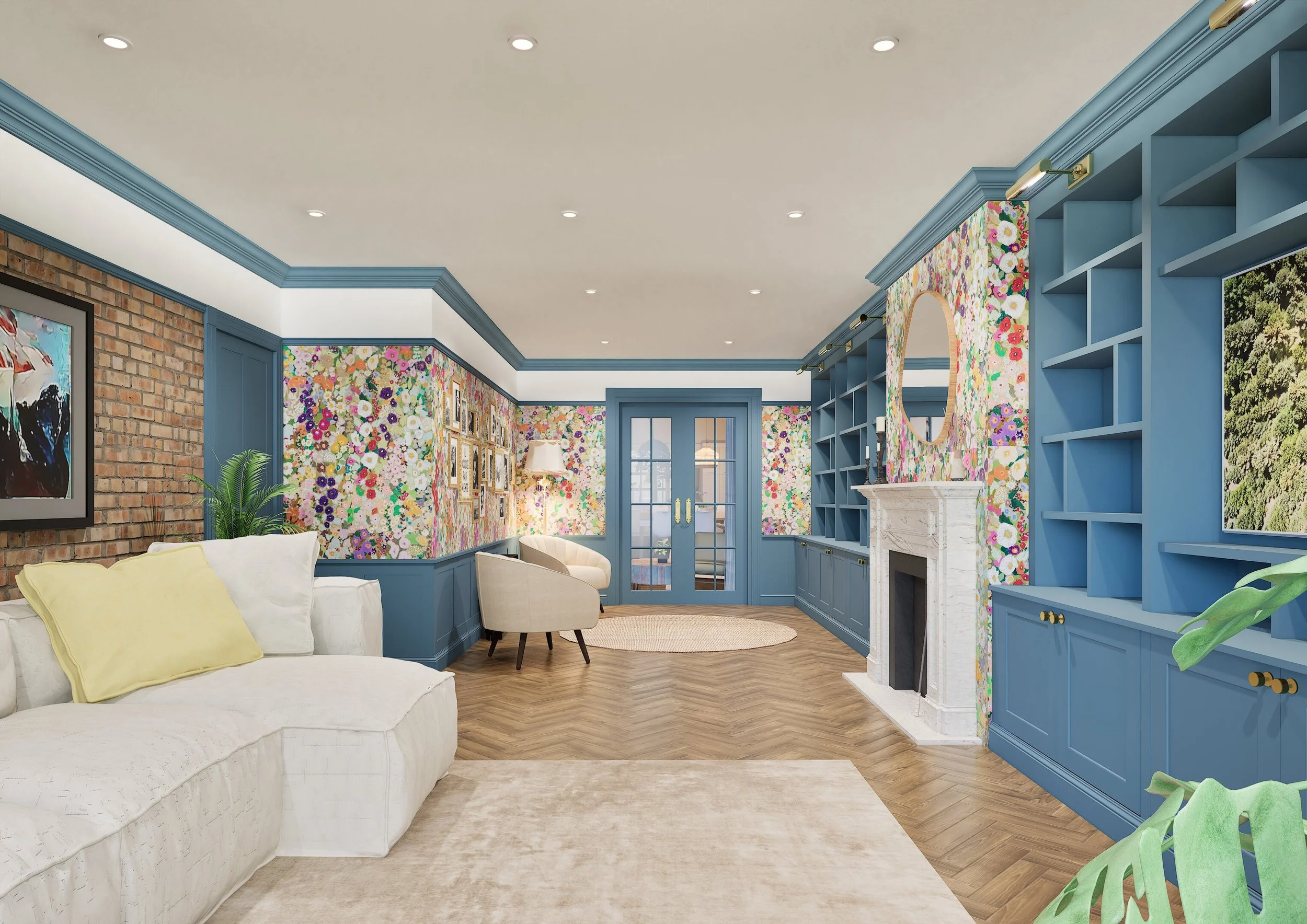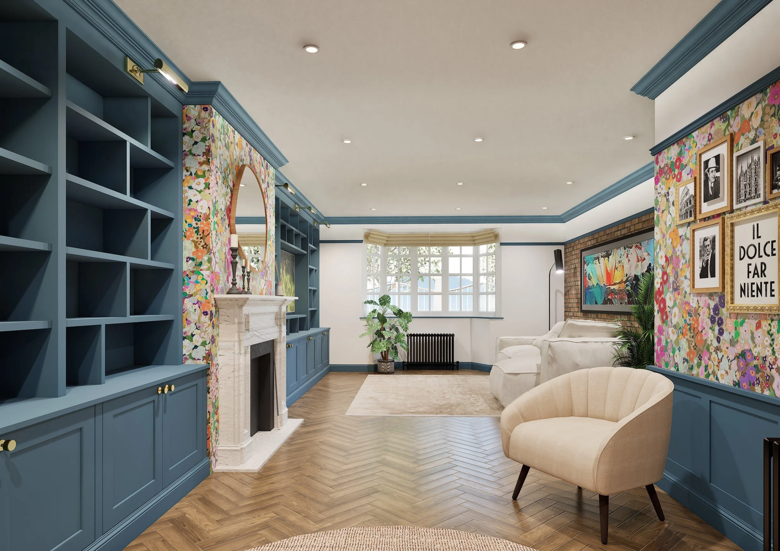 A unique media unit and custom wall paneling set the tone in this standout space, brought to life with bold, designer-selected wallpaper. The striking contrast of textures and clean detailing captures the interior designer’s vision—balancing function with expressive style.
